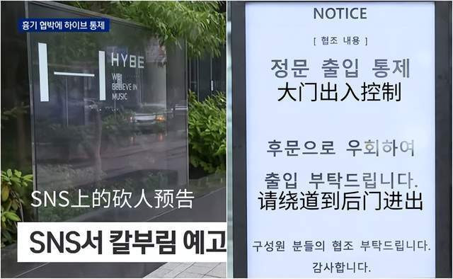例如韩国四大经纪公司之一、防弹少年团所属的的娱乐公司 HYBE ,也被人针对说 “ 要在办公楼前砍人 ” 、 “ 希望方时赫会长在 ” 。