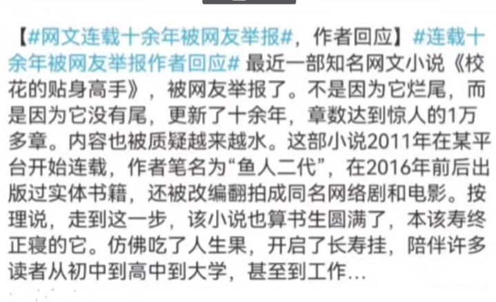 然而当年追出的朋友一定不会想到,这本书实际上要跟读者比命长,因为时隔多年之后,再次帮这本传奇小说冲上热搜的,竟然是来自一位网友的举报,而举报原因很简单,求求大神收了神通,赶紧完结吧。一本书连更12年,写下2000多万字,当年读者的儿子都会打酱油了,作者竟然还是没有收尾的迹象,就问你顶不顶得住?也正因如此,许多人,都猜测作者和某点有着PY交易,签下了神秘的养老条约,里边的大致意思就是,只要这本书还没完结,那每个月都会有几万块钱的保底。但是这真的是这样吗?