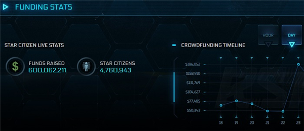 《星际公民》的众筹始于2012年9月份,现在过去11年了,官网公布的最新数据显示,全球玩家们为这个项目众筹了6亿美元,注册的用户数量超过476万人。