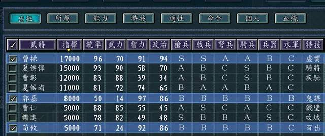 永安一座城,城里八个将,曹操在三国志11虎落平阳剧本的开局就是这么的穷途末路。当然,老玩家们看武将名单也能找到一丝安慰,虽然条件是艰苦了些,却还没有到绝路的地步。曹操+郭嘉+荀攸能够凑得成“虚百鬼”,控制能力还是相当强悍的。