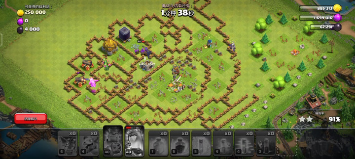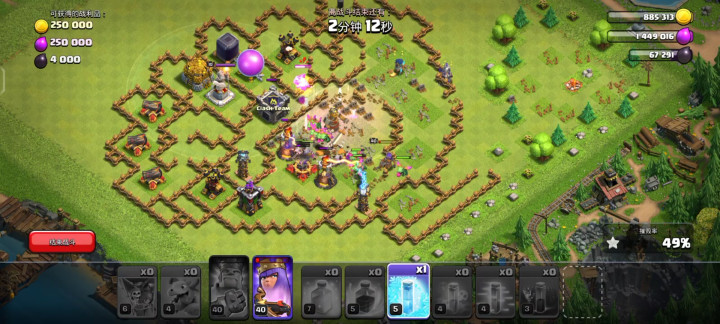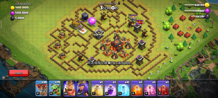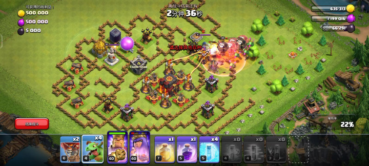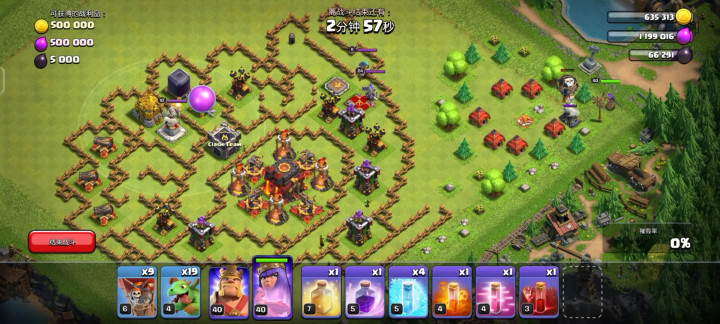 当然了在我们“一点下兵”的时候,法术药水也要跟上,例如碰到敌方英雄的时候,我们要释放“毒药法术”或者是把“骷髅法术”释放在“防空导弹”的下面,目的就是要减少“大部队”的损失,提高我们的成功率。