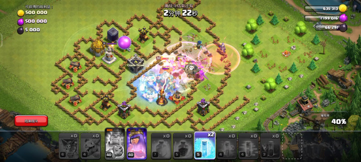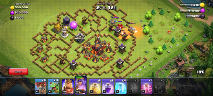 当我们大部队接近敌方的“核心区域”以后,我们就算成功一半了,19只龙宝、10个气球兵的攻击力还是很强大的,还有就是这个阵型的“城墙”等级很低,所以“蛮王”和“女王”也会在第一时间参加战斗,这就是城墙等级低给我们带来的便利。