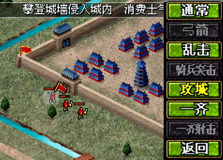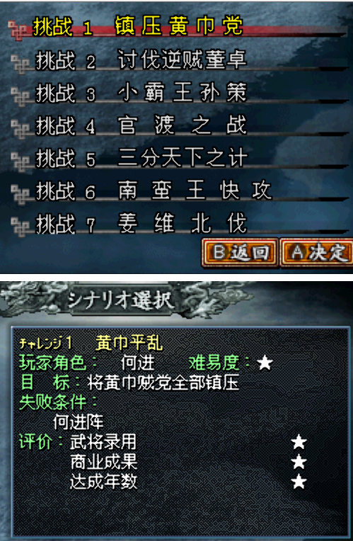 前者指的是在传统玩法上,增加了不少选项。在部队的【攻击】上,以往就是通常、一齐、奇袭、弓箭、火箭、突击和单挑。DS模式增加了很多新元素,例如单骑直入就是将军一个人突入敌人阵中,特别适合吕布、张飞等猛将,可以给对方打击、士兵不受损失同时降低对方部队的士气;骑兵突击可以对1-2组平地上的对方部队收到打击,并且有机会2回合内令对方混乱!还有威吓射击,如果玩过《太阁立志传》、《织田信长传》的朋友就会知道这种是远程部队有机会令对方陷入不良状态,此作是混乱;如此还有一起射击、牵制等等,等待各位玩家来发掘。是不是想想都兴奋!