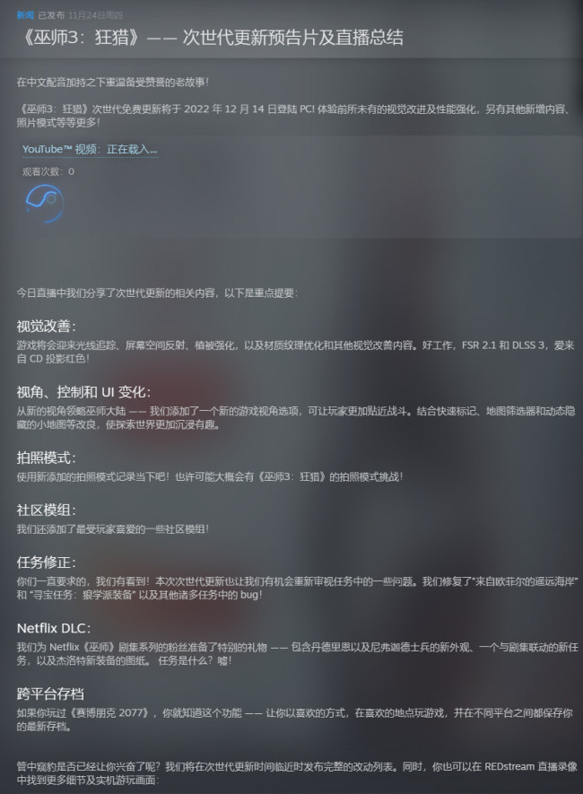 除此之外,次世代更新还有“照片模式”,改进玩法/战斗,每个地区都有更高品质的贴图,树叶等视觉改进,镜头、控制和UI改动,整合了MOD,任务修复,NetflixDLC,跨平台进度。