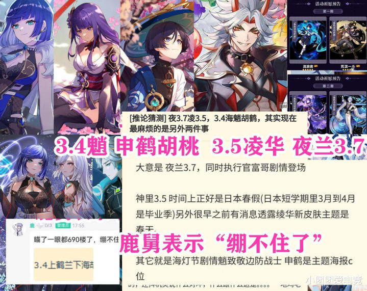 毕竟3.2草神,持有率80多,基本榨干了不少微氪玩家,3.3雷神散兵更不用多说,3.4夜兰大家屯不了多少原石,再加上一个藏了一年多的胡桃和一个高人气的海哥,还有一个来自于2.7版本的人权角色夜兰,无论是顶级增伤还是跑图快都是大家所需要的,这几位角色实在让人纠结,但就在刚刚,鹿舅表示这消息很滑稽。