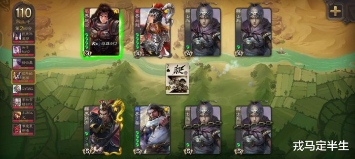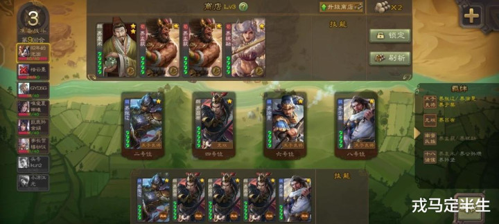 开局的时候有八个人,每个人会有一个商店,每一次商店刷新会有三个武将,而玩家人做的就是用粮草购买其中的物价,购买完毕之后可以将这些武将排安排这些武将上场。每名玩家能够上场的武将有四位,没有上场的武将系统会自动安排一个1滴血的士兵。