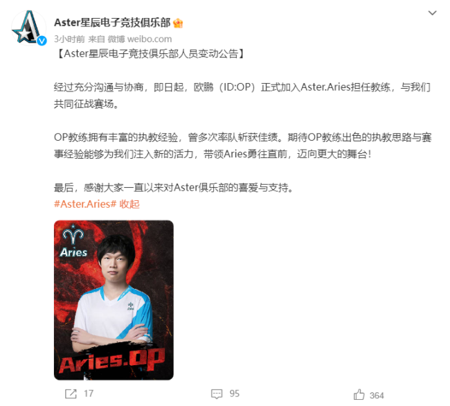 经过充分沟通与协商,即日起,欧鹏(ID:OP)正式加入Aster.Aries担任教练,与我们共同征战赛场。