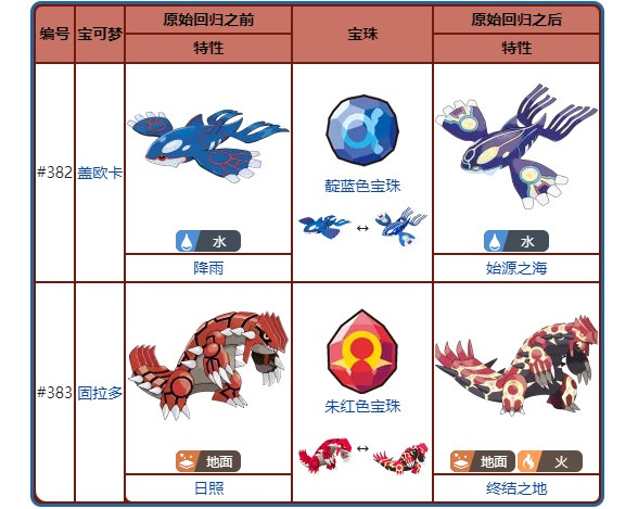 盖欧卡和固拉多只需携带对应宝珠,派出来战斗时就会进行原始回归,变为原始盖欧卡和原始固拉多。在双方同时登场的前提下,原始回归的发动优先度在变身者、复制等入场时发动的特性之后,但对于已经发动过原始回归的固拉多或盖欧卡,他们的特性发动优先度与入场时发动的特性相同,发动顺序由在场宝可梦的速度决定。