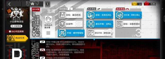 先说词条选择,3级词条这个没啥好说的,必须要悬赏,然后2级词条选择强化石像鬼还有提高敌人生命值,不要提高敌人输出即可,1级词条不要选择防守点1,直接选爆破装置数量降低到0即可,这几个词条相对来说是最简单的,在干员使用上也非常的亲民,另外这次的石像鬼漏了就漏了,反正不选防守点1,漏掉两个石像鬼无伤大雅。