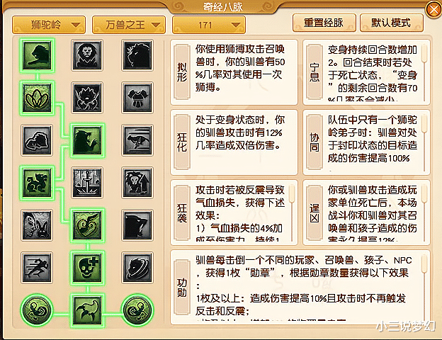 上面是小编想出来的万兽之王流派的加点方式,能够提升幼狮的输出,幼狮攻击处于封印状态的目标时的伤害能够提升100%,也就是幼狮所造成的伤害要比正常的狮驼岭使用狮搏造成的伤害高一倍,通过上面的这样的经脉,小编感觉辅助狮驼岭在高端难度任务中是非常好用的,他们拥有着控制能力,也拥有着输出能力。