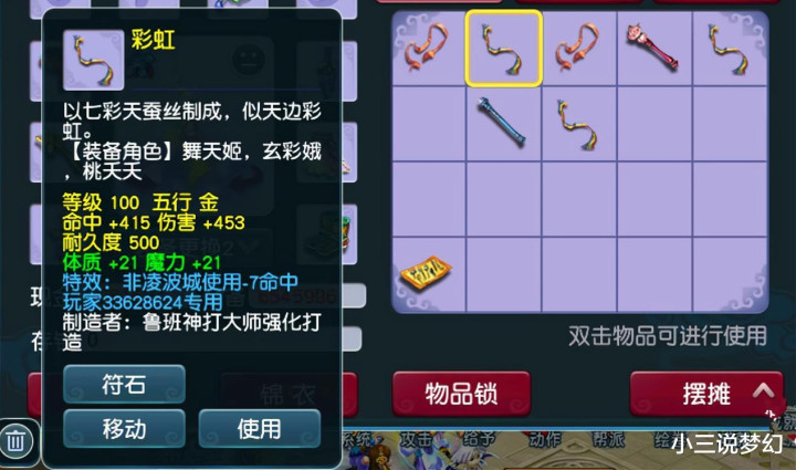 上面是一把100级物理系梦想的武器,这把100级物理系梦想的武器增加了21点体质和21点魔力,通过所增加的属性来看,上面的这位玩家应该不能够在玩凌波城了,因为这是一把给法系使用的武器。