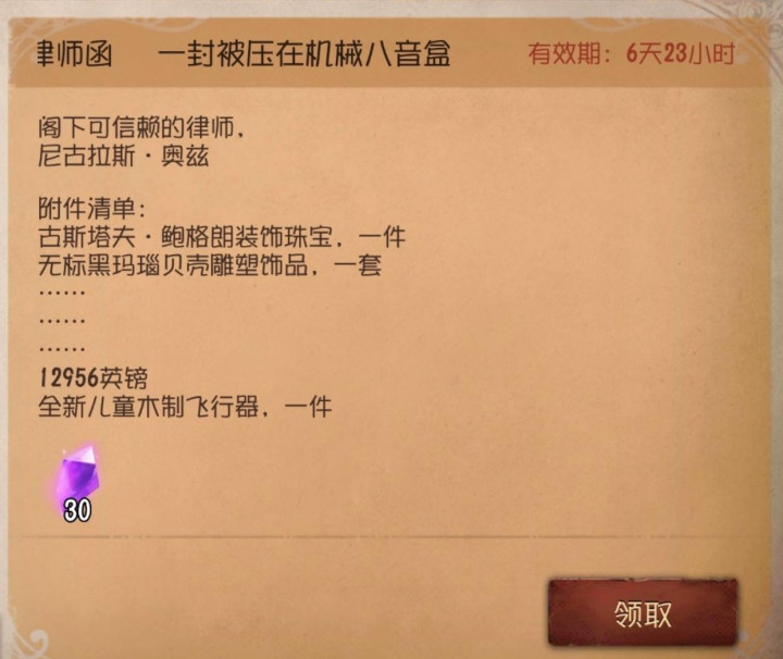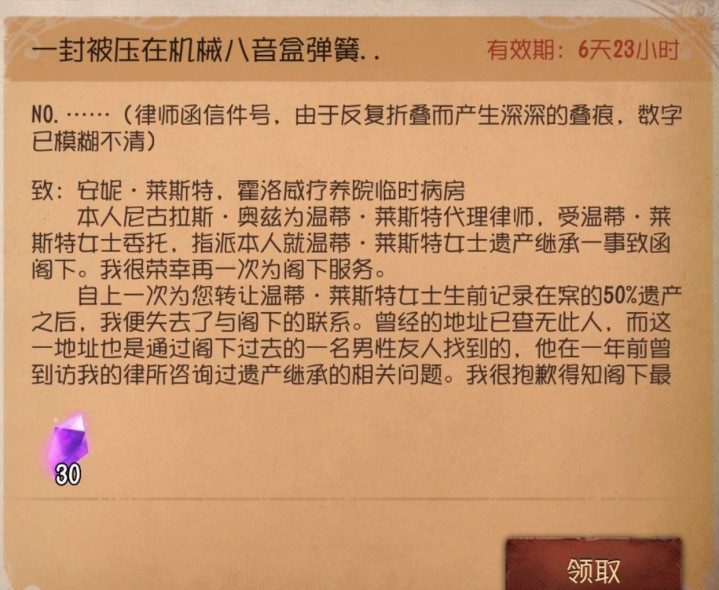 这是一封被压在机械八音盒弹簧内的信件,信件的内容是一张“遗产清单”。
