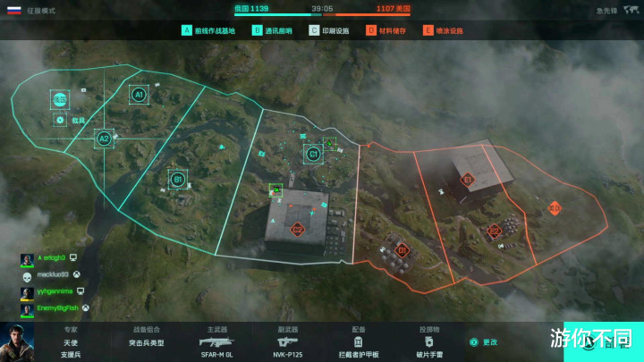 另外游戏需要占领的点位设计的是一条直线,ABCDE各个区域分布的是比较合理的,所以我们作战区域主要是在C1和C2两个区域内进行战斗,而在通往其他区域的几个必经之路有几个会玩载具的防守住就可以了,这一点就避免了敌人突然从你的身后出来打你一个措手不及。