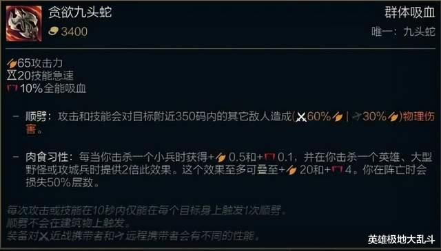 坦克装心之钢火了,但高热度并不代表装备强度高。而另一件小重做后的战士装备最近越来越多AD英雄开始出,甚至优先级到了可以第一件出的地步,它就是贪欲九头蛇。重做后的贪欲九头蛇和尼菈相得益彰,大乱斗胜率已经冲到53%,十分给力!