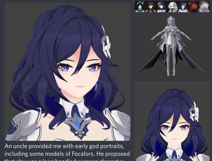 来源消息目前得不到确定,只能大致估测是通过某些现成的建模或者是其他游戏建模加工,从而创作了原神“水神”的同人作品。