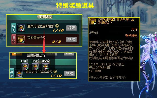 【二】特别奖励。在“特别奖励”中,涵盖了“每周”和“累积”奖励:①每周任务需通关史诗之路,一共有3个阶段,1阶段给5点疲劳,2阶段给10点疲劳,3阶段给20点疲劳;②累积奖励需完成“每周任务”3次,这才可以解锁,也就是需要3周时间,给105级固定属性史诗装备自选礼盒(武器除外)。