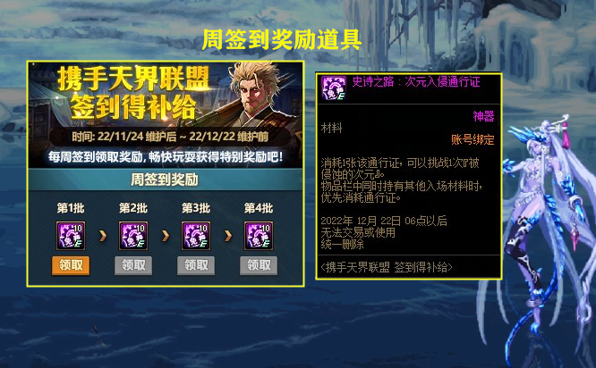 “携手天界联盟,签到得补给”活动,11.24版本会更新,包含了两种层次奖励,分别是“周签到奖励”和“特别奖励”,需达成不同的条: