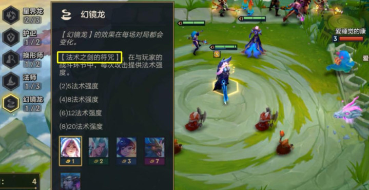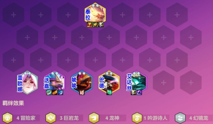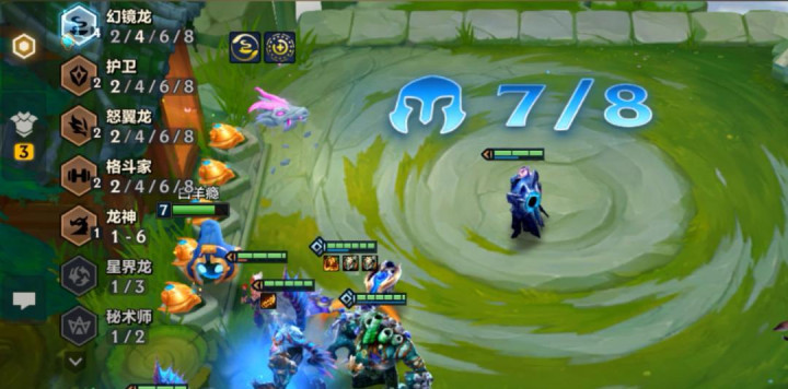 这是一套七费卡主C的逆风速七、顺风速八运营阵容,相对于传统的敖兴,阵容成型难度真的低了一大截,所以看到法剑幻境,一图必玩这套四龙迭嘉。