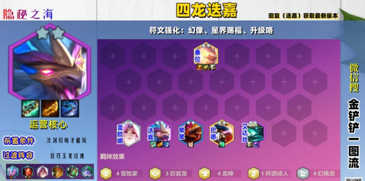 这期一图给你分享的是四龙迭嘉的阵容攻略。狂欢版本的到来,让四龙在高分段举步维艰,能大成的四龙敖兴屈指可数,就算丝血大成,遇到黯灵狮子狗也很难活到决赛圈。