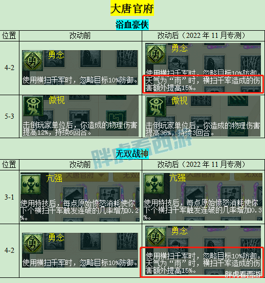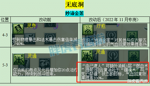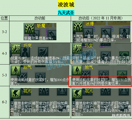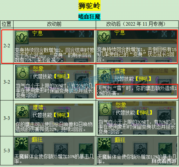 首先来看关注度最高的狮驼岭,跟上次改动相比,狮驼岭削弱程度降低,死亡不掉变身回合数还是改没了,但是雪天鹰击能增加10%伤害。