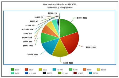 大家之所以给出接近腰斩的价格,其实并无道理,对于玩家来说,基本上同数字的不同代的产品,大家会默认是下一代的替代品,而RTX4080的价格要比RTX3080的价格高出500美元之多,也难免玩家会给出直降一般的理想价位,整体来说玩家给的还算合理。