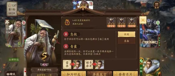 华佗的“急救”技能效果:急救技能触发后,如果华佗的手牌中拥有红色牌,可以利用急救技能效果帮助华佗回复一点血量。华佗的另一个技能青囊,也属于救助技能,华佗可以丢掉一张手牌,帮助一名角色回复一点血量。