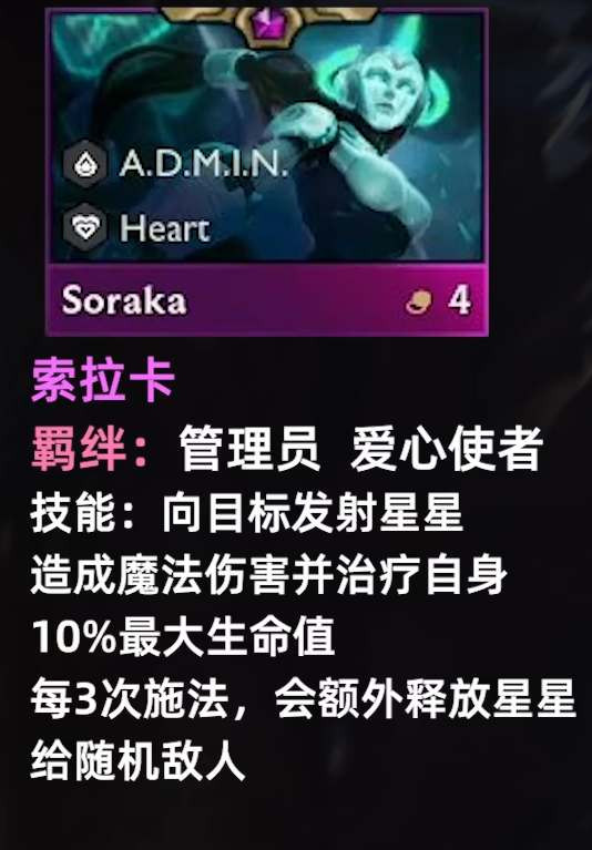 1、索拉卡是4费卡,羁绊是[管理员][爱心使者]