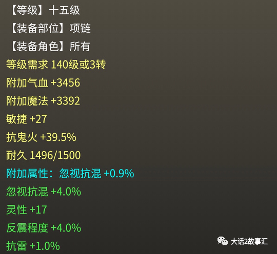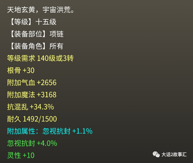 接下来看看一条10万元成交的项链,底子是根骨加30,抗混乱加34.3,蓝字是忽视抗封加1.1,炼护按效果是忽视抗封加4,灵性加10。忽视抗冰的项链能卖出这样的价格,那么忽视抗混的极品项链卖几十万应该也不意外了。