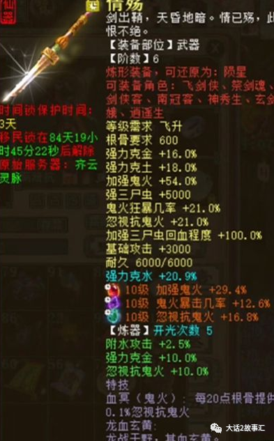 再来看几件男鬼武器的天花板,底子是加强鬼火54,鬼火狂暴几率21,忽视抗鬼火21,强三尸虫5000,加强三尸虫回血程度100,蓝字是强力克水20.9,炼器效果是忽视抗鬼火10。特技是血冥,每20点根骨提供0.1忽视抗鬼火,打了三颗10级宝石。这样奢侈的男鬼装备,下副本一定很有效率吧。
