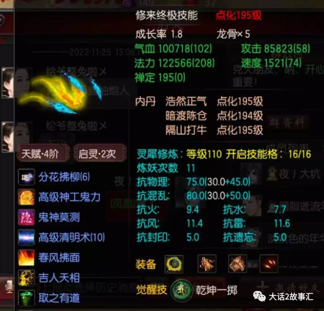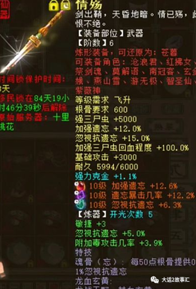 大佬的极品装备从来都不会只有一套。底子同样也有强三尸虫属性,主要是加强遗忘12,忽视抗遗忘15,炼器是忽视抗遗忘5,敏捷加3,特技是魂骨忘,每50点根骨提供0.1忽视抗遗忘。同样是打了三颗10级宝石。这应该是小编见过最强的男鬼玩家装备了。