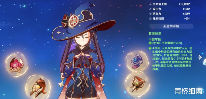 划重点:辅助莫娜的圣遗物不需要坐牢,妹纸建议小可爱们把宝贵的体力和“狗粮”资源给到C位角色身上,辅助莫娜的面板带【4千岩】充能也不是很看重,越高越好。但如果带【4宗室】,元素充能至少要达到210以上。