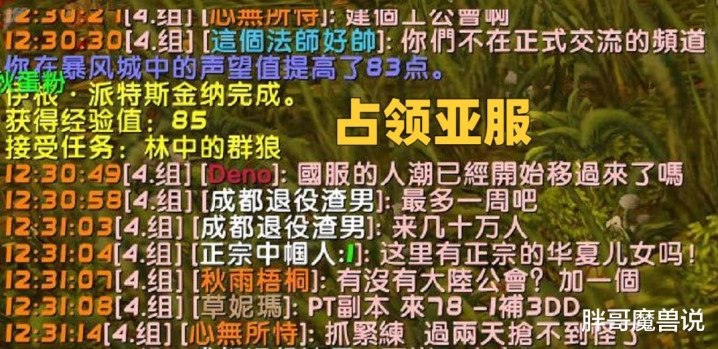 亚服的玩家数量本身是非常稀少的,因此即便是首批前往亚服的国服玩家并不算多,也依然成功占领了亚服。目前在亚服玩魔兽世界和在国服玩魔兽世界已经没有什么区别了,亚服俨然已经成为了国服的一个分区。