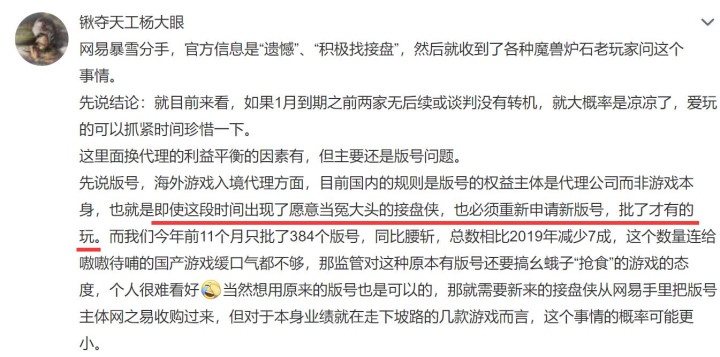 最正确的答案是——忘掉这些,该怎么玩怎么玩。暴雪国服目前有炉石、守望、魔兽、暗黑3、星际争霸、风暴英雄、魔兽争霸七大IP,各个都需要版号。这不是钱的问题,上次海外游戏版号还是去年六月发的,绝地求生国服从2017年申请到2022年也没了消息,版号这东西再有钱也拿不到。所以对于国服来说,要么是后续继续由网易接手,要么陷入无限期的停服。