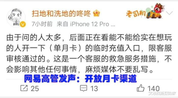因为太多玩家找到了网易法人张东,他不得不站出来为大家想办法。这次他澄清说,他将在接下来的几天内开通一个临时的月卡充值入口。为防止大家滥用,本次充值需要客服审核。