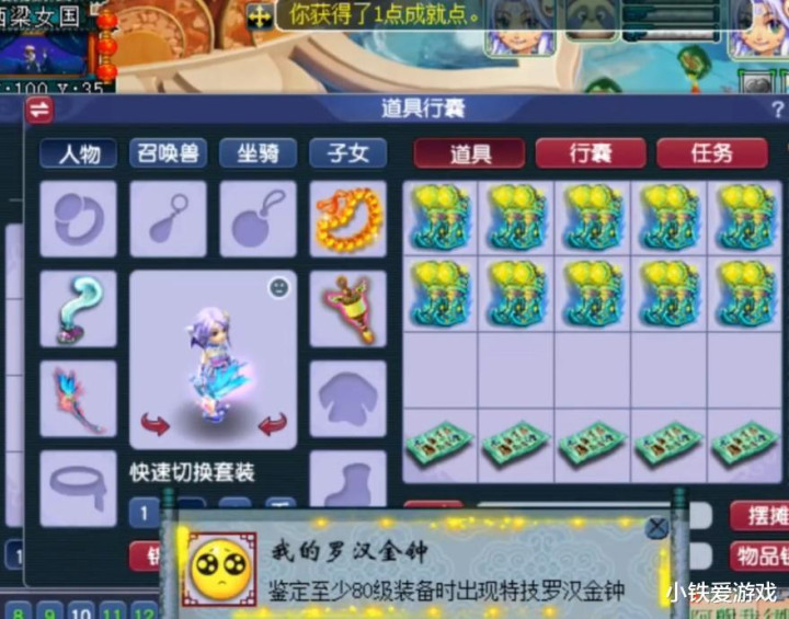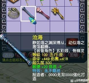 这把100级的棒子属性是真的极品,418伤害、449命中、单加20敏捷、减3体质,附带蓝字永不磨损。命中和伤害都非常的高,关键是加了敏捷,适合普陀山、地府、无底洞这几个固伤门派用。但是,物理系凌波城也可行啊!鉴定之初就是因为玩家有3个女角色都是能用棒子的,武器眼看都是失败修理3次没法用了,就去鉴定3把,结果就逆袭了。不过也没必要卖,完全可以带到129级,等渡劫后再换别的。