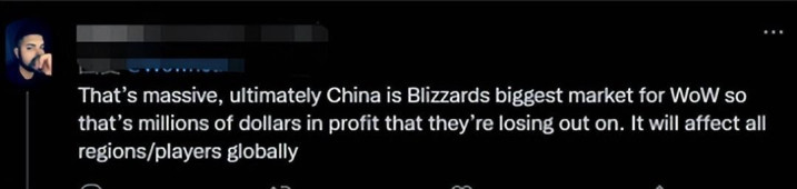 ——这可是大事儿,中国市场的《魔兽世界》是暴雪巨大收入来源,现在几百万美元收益丢失,将会影响全球的玩家。