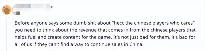 ——防止有人说“中国玩家谁在乎”。必须知道的是,中国市场是暴雪巨大的收入来源。如果这一来源被切断,暴雪将无力支撑新内容的开发,这不仅仅是对中国玩家的伤害,对我们来说也是坏消息,如果他们找不到新的渠道在中国运营这些游戏的话。