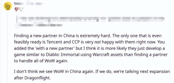 ——想要找到一个新的中国伙伴是很困难的,目前只有腾讯有这个实力。即便谈了新的合作伙伴,更有可能会联合开发出《暗黑破坏神:不朽》这种科技游戏,而非处理魔兽世界的问题。