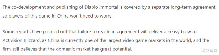 Pandaily则认为暴雪的行为非常不明智——网易和暴雪未能达成续约,将给动视暴雪带来沉重打击。因为中国目前是世界上最大的电子游戏市场之一,该公司仍然认为中国市场潜力巨大。一言以蔽之,这些媒体认为暴雪对自己目前所处的市场地位和前景,没有一个清晰的认识。