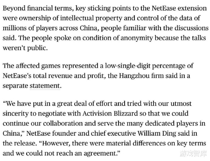 此外,彭博社也撰文称,暴雪想要“知识产权的所有权”和“对中国各地数百万玩家数据的控制”,也是暴雪网易终止合作的原因之一。