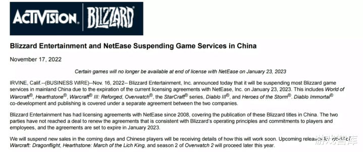 一周之前,暴雪发布2022第三季度财报时,就已打过预防针,虽然语焉不详,但表示中国方面的业务续签出现问题。直到11月17日暴雪单方面“先行”官宣,网之易被迫确认旗下的“战网全家桶”将会在1月23日停止运营。也是农历新年初二,网易暴雪这样一个在中国玩家脑中牢牢绑定的名词,将在这一天画上句号。