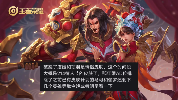 根据这位爆料大神透露的信息来看,下一套情侣皮肤也就是情人节限定皮肤是项羽和虞姬的,因为在这个时间段出现了这两位英雄新皮肤的格子。