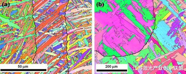(a)SLM材料在850°C下冷却2小时后,然后进行炉子冷却的EBSD取向图。(b) SLM材料在1020°C下半小时后,然后在730°C下2小时并风冷。对比由α相的不同取向提供,而β相则以α相之间的薄层形式存在。请注意不同的比例。两个图像的生成方向均为垂直。
