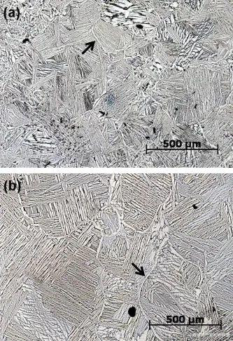 在1020°C下(a)2小时后与(b)在1040°C下20小时后,炉子冷却后α菌落尺寸较小的图示。α阶段是浅的,β是黑暗的。箭头表示晶界α。