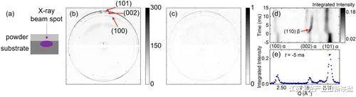 图6显示了从500μm厚的Ti-64衬底上采集的典型衍射数据∼60μm厚粉末层。以1kHz的采样率收集数据,并将激光设置为400W的功率,扫描速度为576mm/s。X射线束与束中心对齐,如图6(a)所示,基板顶部以下25μm。在这种几何结构中,整个采样体积在基底内,粉末层的贡献最小。图6(b)显示了在1kHz下收集的1500个衍射图案的总和,相当于1.5秒的收集。图6(c)显示了激光熔化前在1kHz下收集的二维衍射图案。图6(d)显示了在1kHz下收集的积分一维衍射图案的时间序列。激光熔化前后收集的衍射图显示了三个α-Ti峰的峰形状和位置的差异,表明宏观和微观应变状态发生了变化。这些对冷却过程中快速晶体变化的观察,为LPBF制造材料的独特微观结构特征提供了见解。