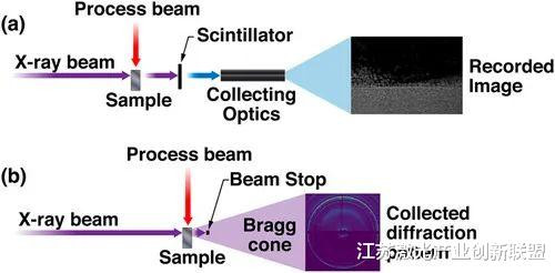 图1实验几何形状的示意图。(a)成像设置示意图。一个大的、未聚焦的多色X射线束垂直于加工激光束照射到样品上,透射的信号从X射线(紫色)转换为可见光(蓝色)。可见光由成像光学器件收集并由高速CMOS相机记录。(b)衍射设置示意图。在该设置中,单色聚焦X射线束以与成像设置相似的几何结构撞击样品,衍射X射线由位于样品后面的混合光子计数检测器直接检测。