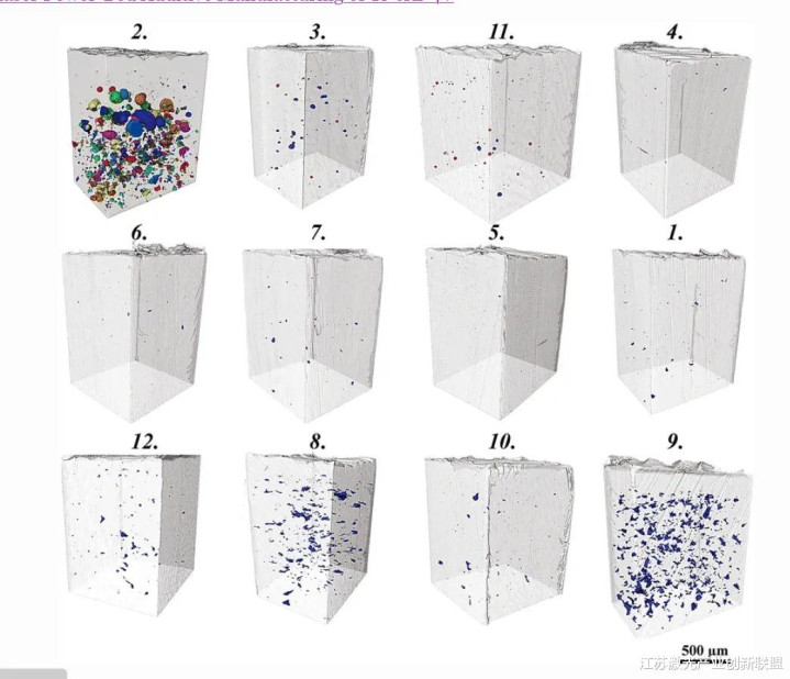 上图给出了每个样品顶部1.5 mm的三维(3D)断层扫描重建的投影,按熔池重叠深度排序。应该注意的是,在 3D 投影中查看孔隙率会夸大样品内孔隙的体积分数。孔隙按形态分割和着色。由于其缺陷种群明显较大,因此由单个孔隙着色。虽然形态不是确定缺陷形成机制的决定性指标,但可以合理地假设高度球形的孔很可能是由凝固过程中捕获的不溶性气泡形成的,而大部分不规则的孔很可能缺乏熔合缺陷。在本实验中,各向异性值0.5用作“球形”孔的最大截止值。