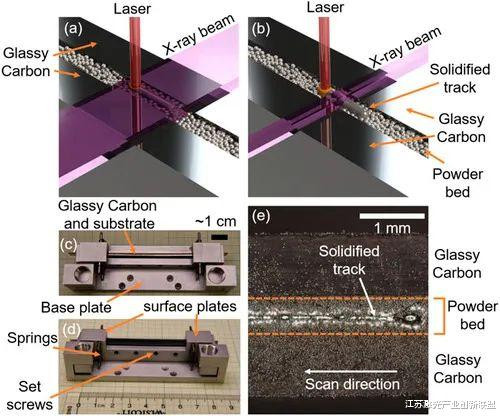 图3样品保持器设计。(a)在成像模式下,用大型多色X射线束照射大部分轨道,对样品架几何图形进行CAD渲染。(b)衍射模式下样品架的类似CAD渲染,具有较小的单色X射线束点,以限制采样体积并提取位置特定信息。(c)和(d)具有玻璃碳窗和基材但没有粉末的样品架照片。(e)在去除粉末之前,从上方观察样品夹持器中典型单个焊缝轨迹的现场图像。玻璃碳窗的边缘用橙色虚线突出显示。