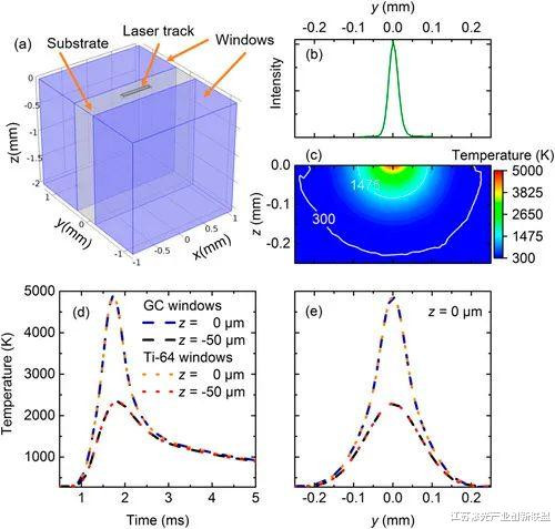 比较了两种系统:一种是基材支撑在两个玻璃碳窗口之间的情况,如本文所述的实验,另一种是两个窗口由Ti-64组成,以模拟大块LPBF情况。这两种情况都使用ε=0.6的辐射边界条件。模型的几何结构如图4(a)所示。激光光斑的测量强度如图4(b)所示。