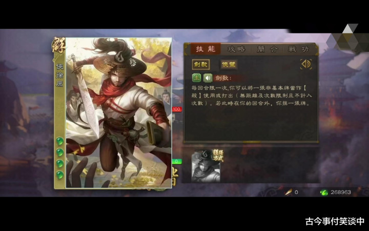 一技能比较好理解,收益也确实低的离谱,堪比将红牌当【杀】的技能。此技能条件限定过于严苛,只能将非基本牌当做【杀】,原因很简单,非基本牌都是用的出去的牌,例如将【顺手牵羊】、【无中生有】、【乐不思蜀】或者【加一马】当【杀】打出那一定是亏的;将【闪电】、【铁索连环】、【借刀杀人】当【杀】打出这技能还算有点用场。无距离及次数限制则代表在自己的回合发动这个技能一定是二刀流。其他的描述可以参考【武圣】,回合之外摸一张牌,收益也没有高到哪里,聊胜于无吧。